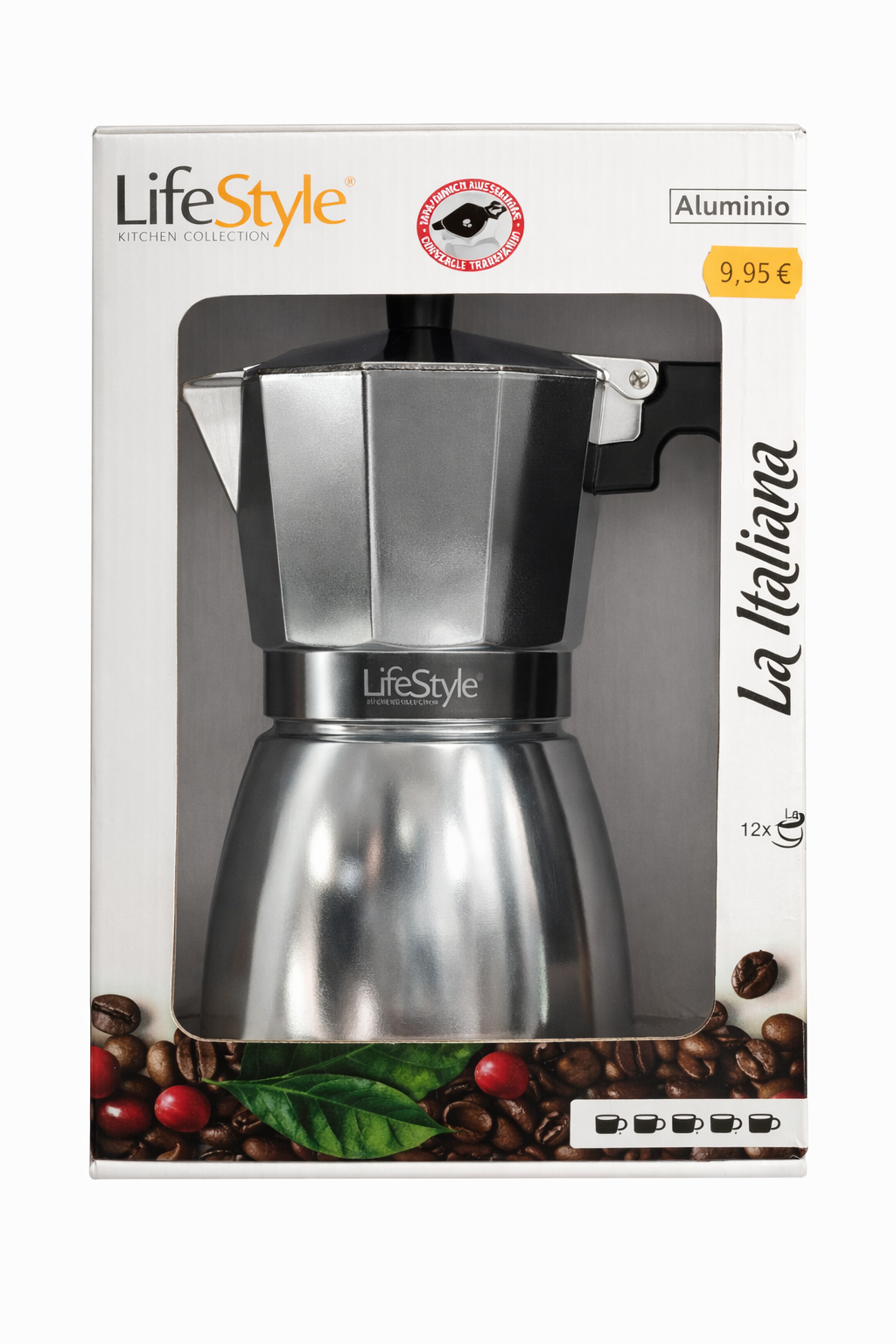 Cafetera italiana clásica fabricada en aluminio, diseñada para preparar café tradicional con todo su sabor y aroma. Su funcionamiento sencillo la hace perfecta para uso diario, ofreciendo un café intenso al estilo espresso de forma rápida y práctica.