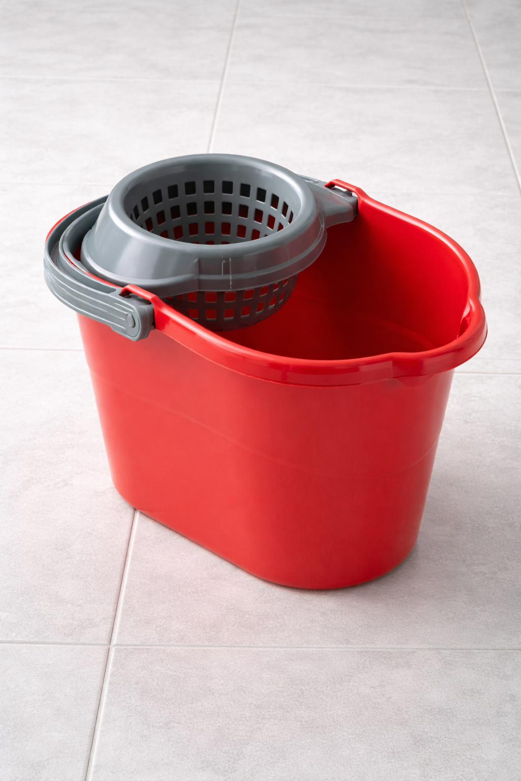 Cubo de fregona con escurridor integrado, diseñado para facilitar la limpieza de suelos de forma cómoda y eficiente. Su estructura resistente y funcional permite escurrir la fregona con facilidad, ayudando a mantener un mejor control del agua durante la limpieza.