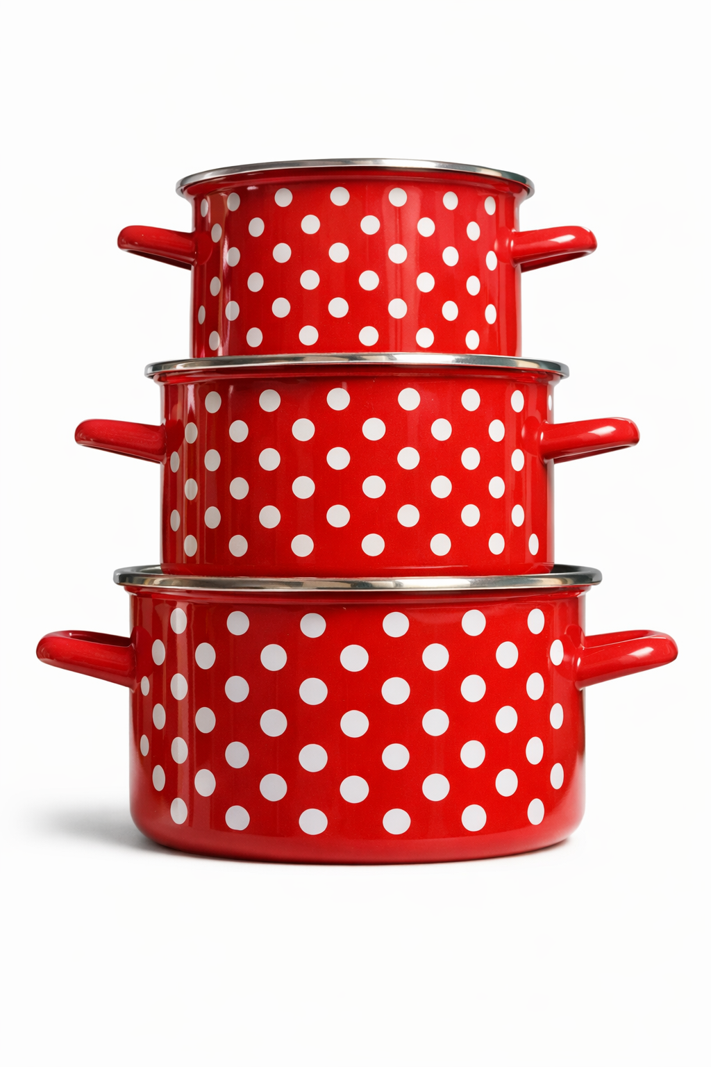 Set de ollas esmaltadas con diseño clásico de lunares blancos sobre fondo rojo, ideal para dar un toque alegre y tradicional a tu cocina. Fabricadas con material resistente, perfectas para preparar todo tipo de comidas de forma cómoda.