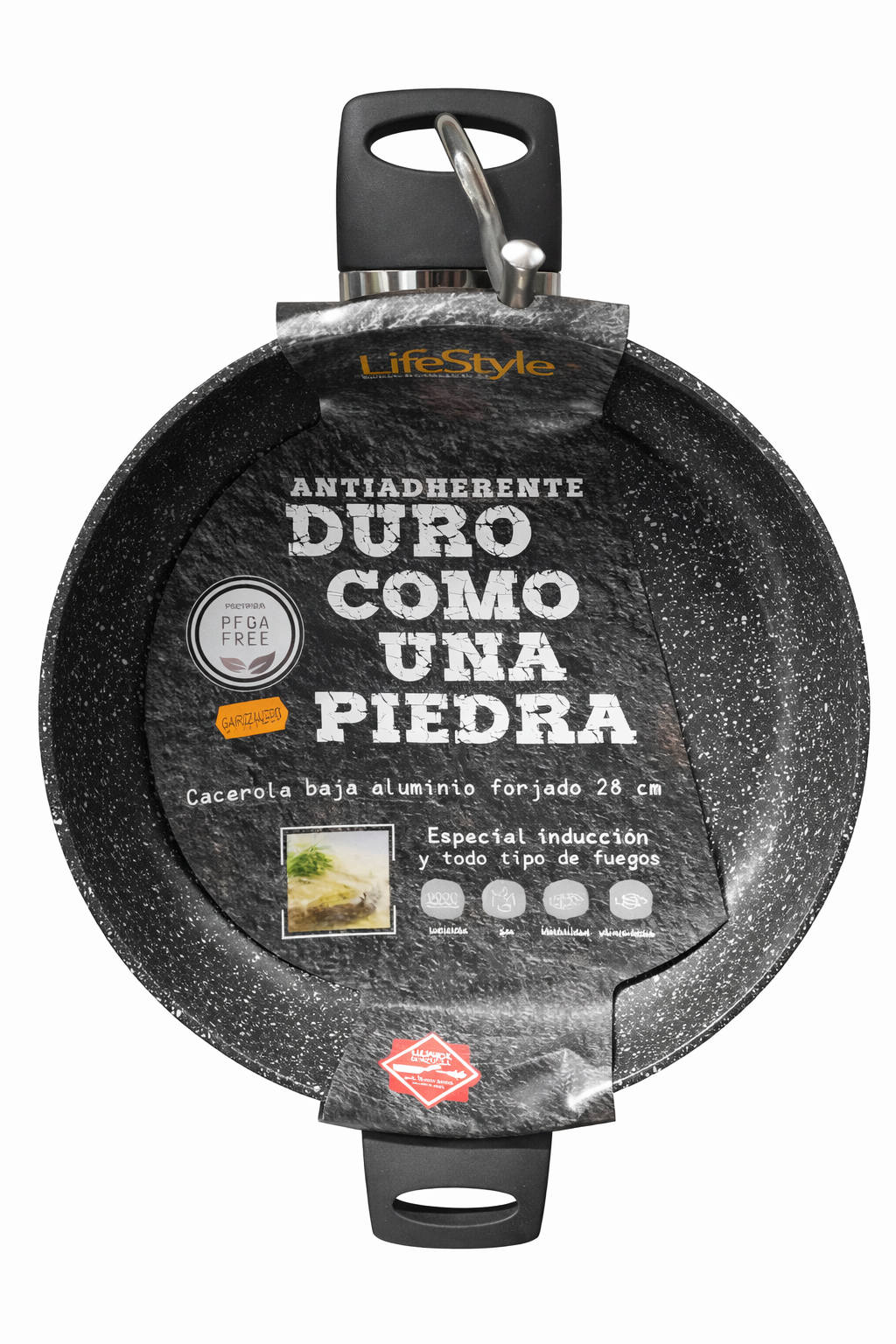 Sartén de aluminio forjado con revestimiento antiadherente efecto piedra, diseñada para una cocción más uniforme y práctica. Su superficie evita que los alimentos se peguen y facilita la limpieza, ideal para el uso diario en cualquier cocina.