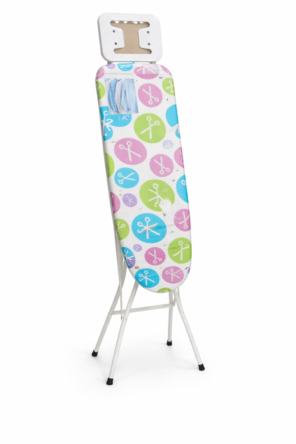 Tabla de planchar plegable ideal para el uso diario en casa. Cuenta con una estructura metálica estable, patas con apoyo antideslizante y una funda acolchada con estampado multicolor que aporta un toque alegre y moderno. Su diseño plegable permite guardarla fácilmente ocupando poco espacio, por lo que es perfecta para pisos, lavaderos o cuartos de plancha.
